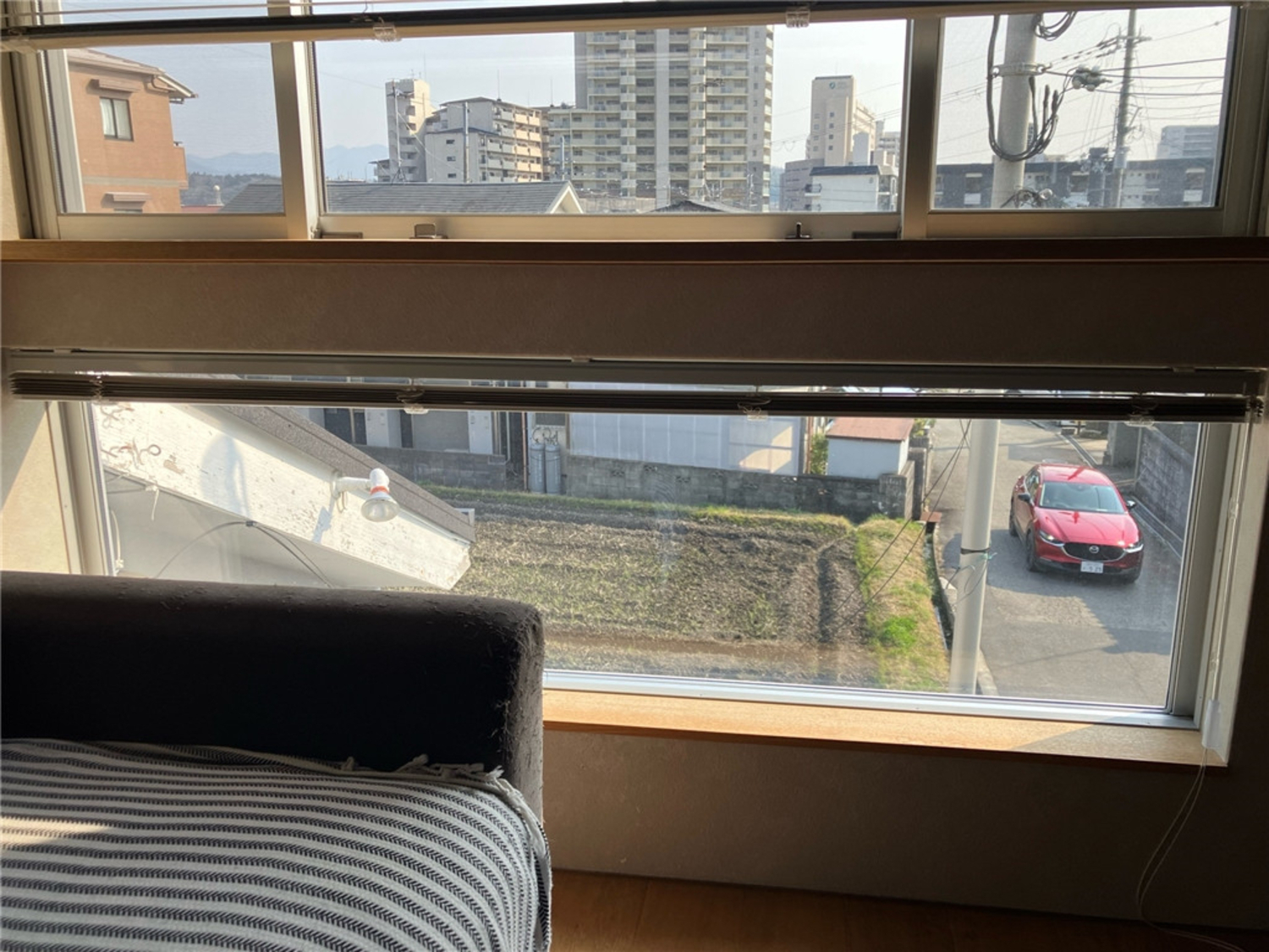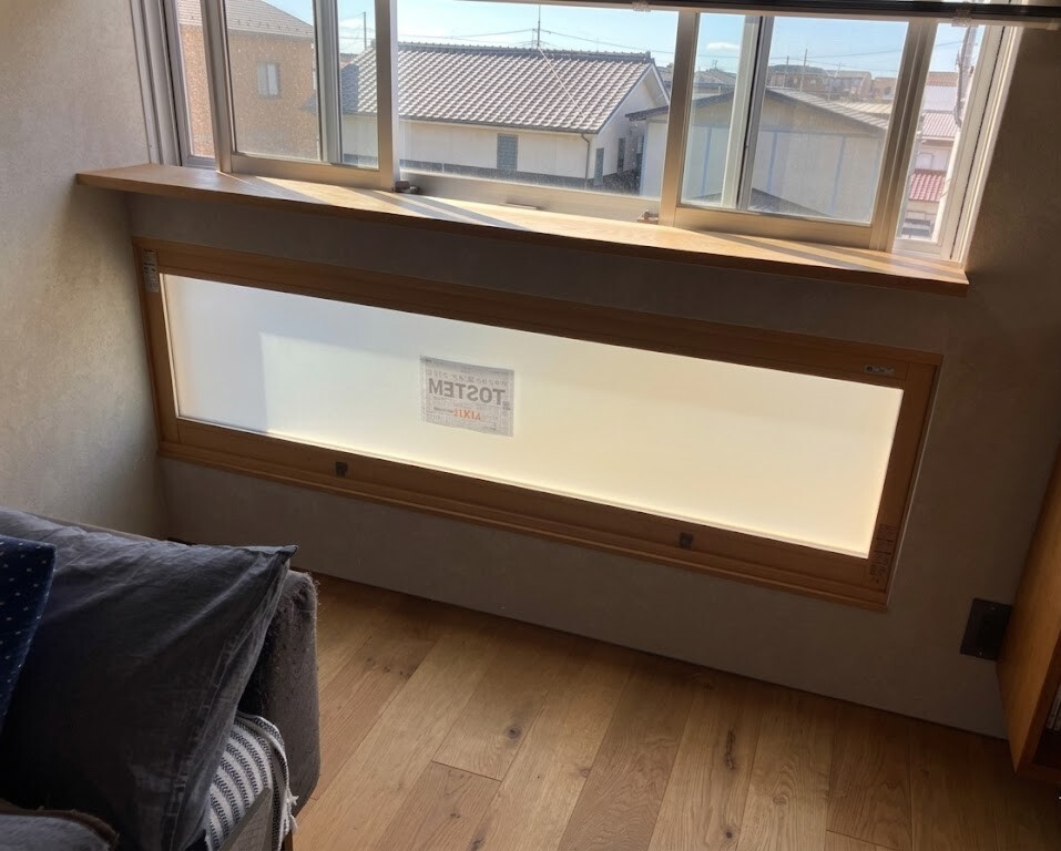 施工前 FIX窓が設置してありますが、上部で見通しが良いため 視線にあたる下部の目隠しでブラインドを設置されていました